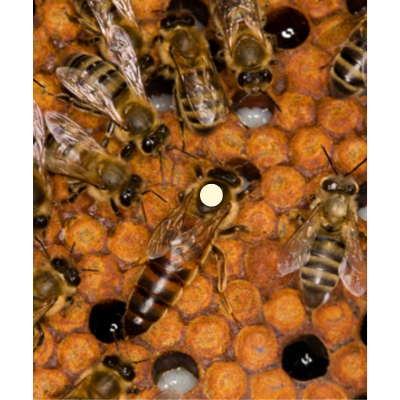 Il s'agit d'abeille de race Buckfast, les reines sont marquées de la couleur de l'année 2022 (rouge),